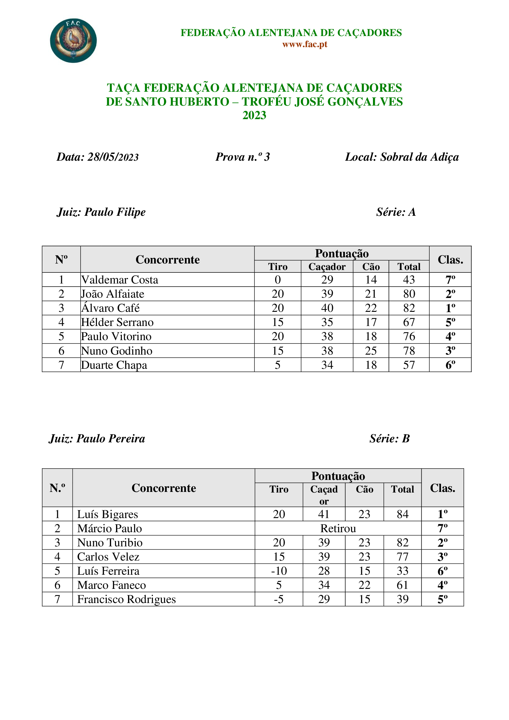 A classificação geral da Taça Federação Alentejana de Caçadores – Troféu José Goncalves 2023 ficou assim ordenada: