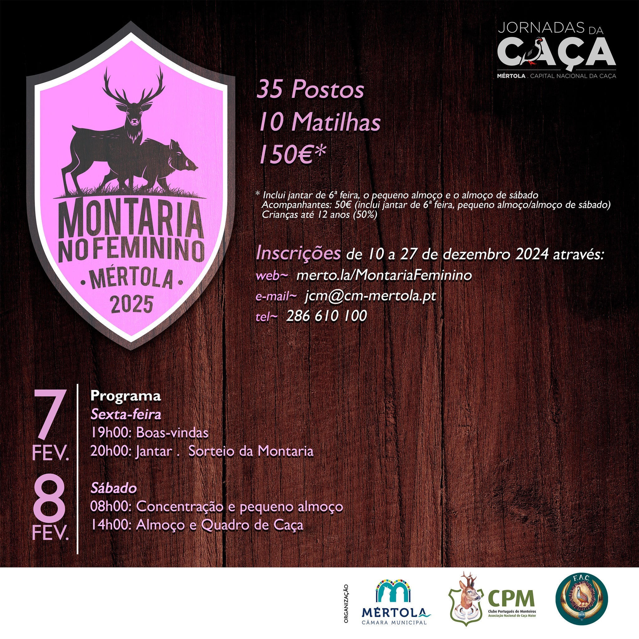A Câmara Municipal de Mértola, em parceria com o Clube Português de Monteiros e a Federação Alentejana de Caçadores, tem o prazer de anunciar a realização da primeira Montaria no Feminino no concelho de Mértola. Este evento, inserido na 3ª edição das Jornadas da Caça, terá lugar no dia 8 de fevereiro.