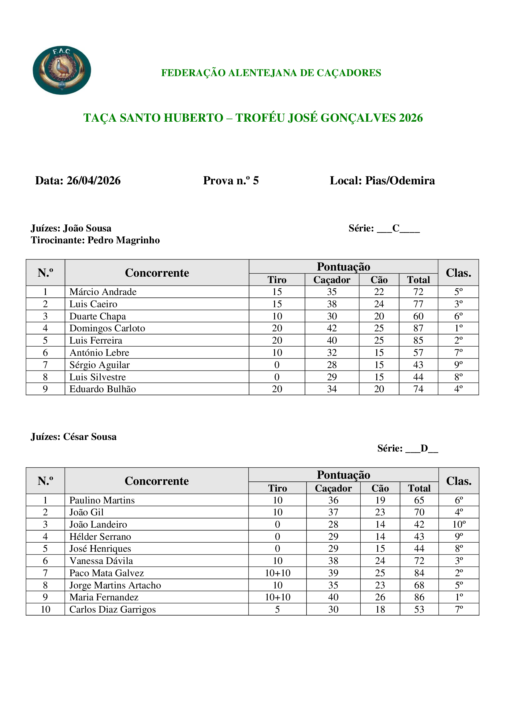 Classificações da V prova contar para a Taça Federação Alentejana de Caçadores - Troféu José Gonçalves 2026
