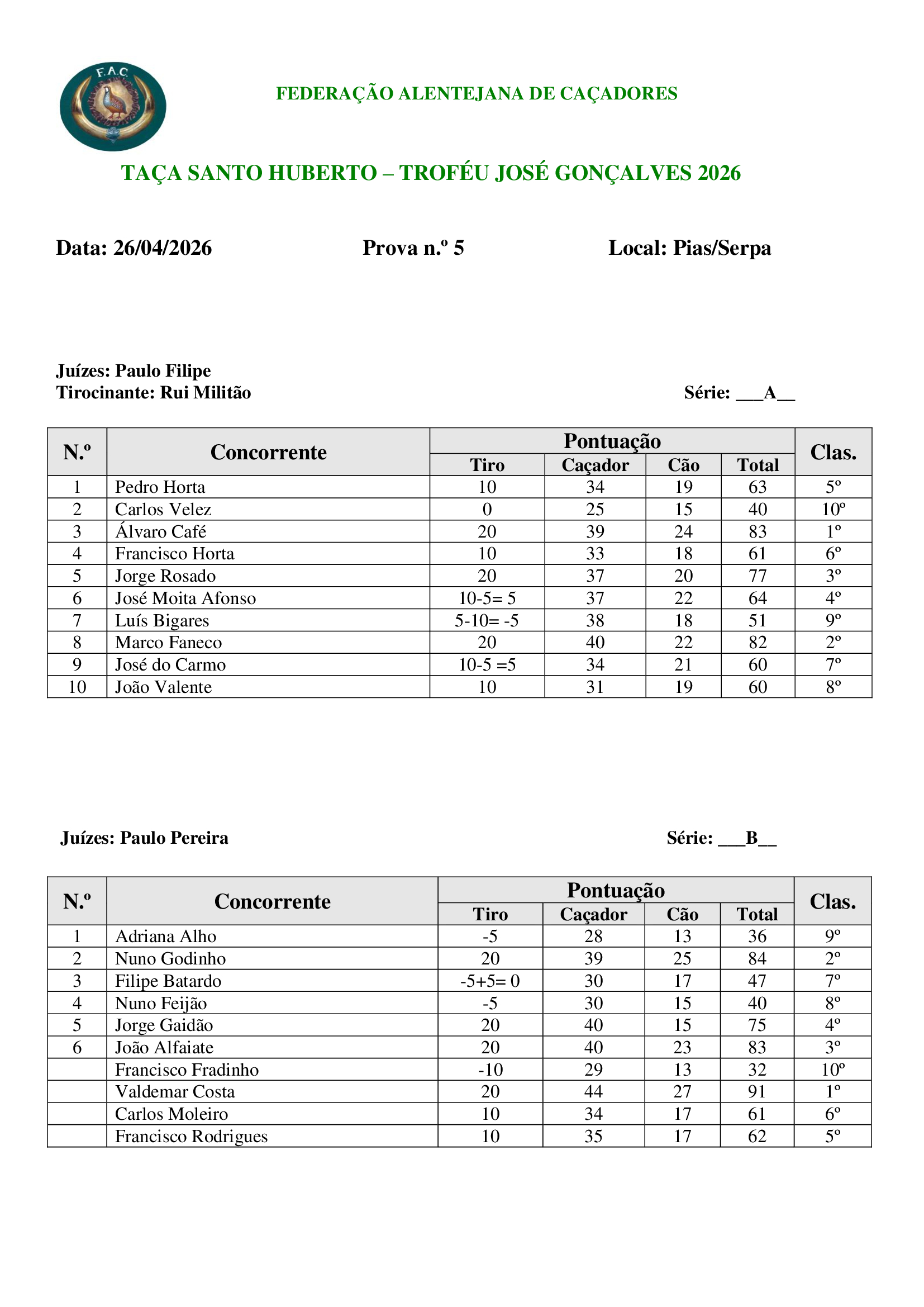 Classificações da V prova contar para a Taça Federação Alentejana de Caçadores - Troféu José Gonçalves 2026